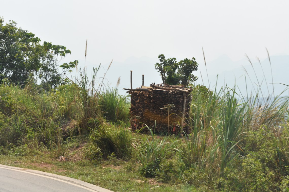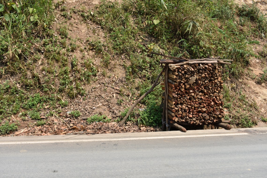 the shelters by the road are building up a red plastering of dust, built up layer on layer from the trucks as they thunder past their dwellings. Clearly there hasn’t been rain here for a while to wash away ‘the traffic’. Fire wood appears to be a major past time here as every now and then men and women appear at the roads edge with bundle of wood. Collected from the jungle all around. They are neatly stacked at the road side or by the homes in uniform stacks between stakes. Each piece exactly the same length. Very precise considering that the native knife, which is carried in its sheath tucked into the rear waistband ready for its daily use, is what is used to fell the up to 150mm thin logs.