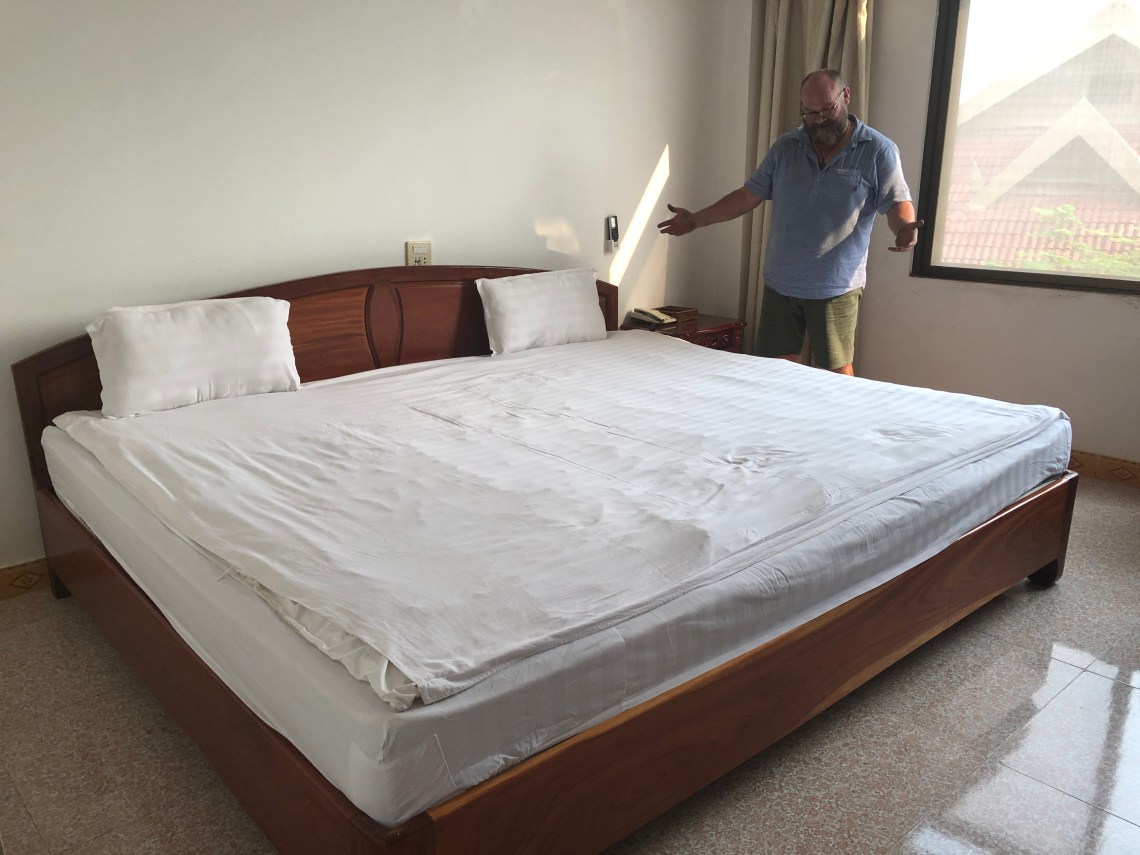I think we are the only guests, but are still placed in a room as far from the lifts as they can at the end of a marble tiled corridor. The rom is big and sparse, no decorations or much in the way of furniture except for the bed which is massive. I mean really massive it must be 4M x4M! And extraordinarily hard. The ‘concierge is behind the front desk leaning back on a chair watching his phone, with a pillow behind his head. Before dinner we look for an ATM. These are everywhere but don’t all work! We reluctantly think dinner might be a skewer or two for 20,000 kip. All that we have left after filling the car with fuel (500,000 Kip). luckily we persevere and end up walking some distance to find an ATM that works. In two days time we cross into China, where we have a guide who will be sitting in the car with us for the duration of our time in China. We rearrange the gear in the back to clear the seat for her. 6 boxes, 2 suitcases, a ports toilet, and fridge freezer, not to forget the 2 x 20 litre water drums. Quite a puzzle.