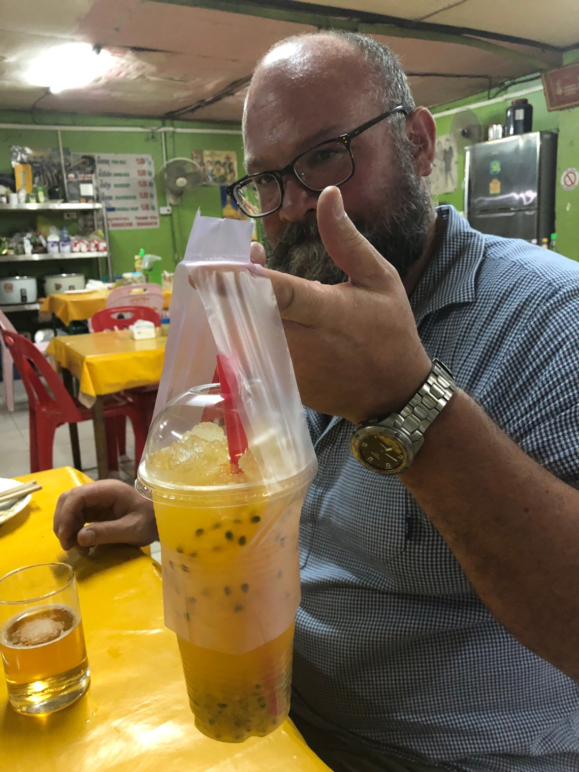 That evening we venture our for a meal. Being good people we feel we should support the hotel we stay at, and therefore the people. So over to the restaurant called “chill chill”. About 50 metres from the main hotel block. The staff however tell us no food and can’t help us or point in the right direction for food. So we leave an walk . Around the corner…….the back of the same restaurant! Is another restaurant which seems quite lively. Loud music and plenty of locals, must be good? so we ask for a menu and a table. The waiter is decidedly unhelpful and besides we can’t hear ourselves talk so we leave. We try two places before finding one with a menu of four choices. Each with a picture. A drink from the fridge and fresh food cooked immediately in front of us from the local establishment wins. At the end of the meal a calculator appears indicating what you owe. 47,000 Kip for two meals, two ‘beerLaos’, a juice and a large container of passion fruit pulp. A bargain.