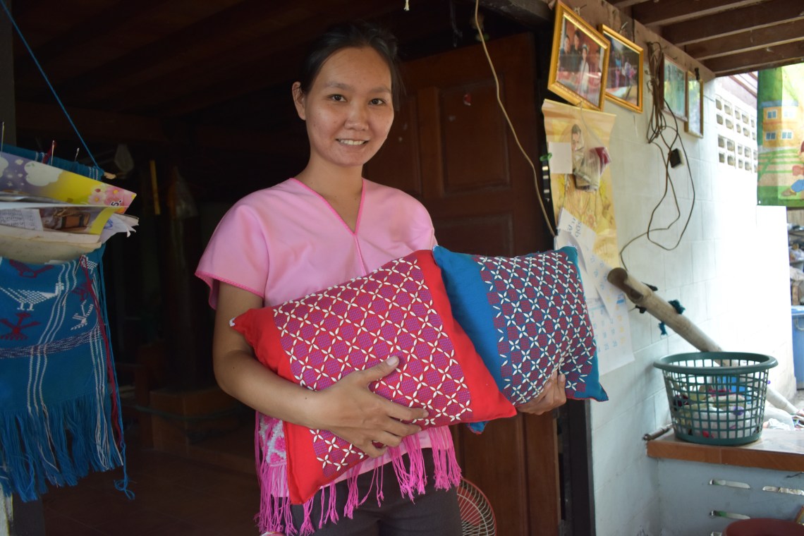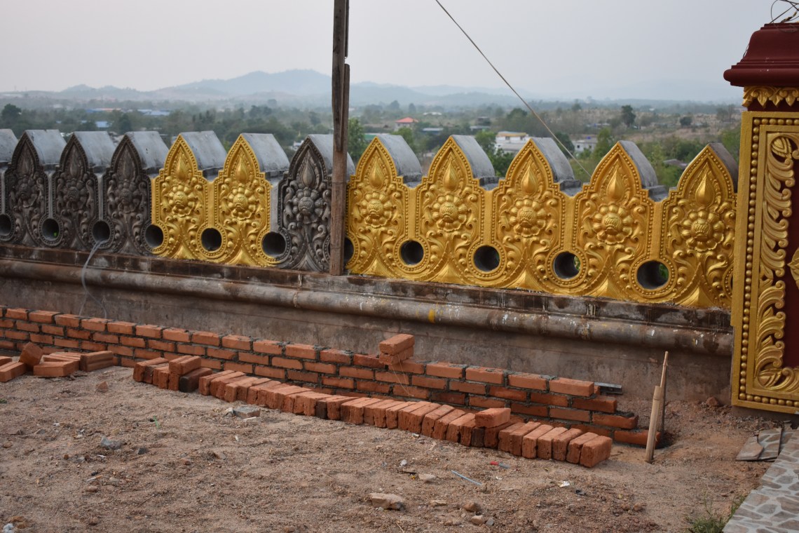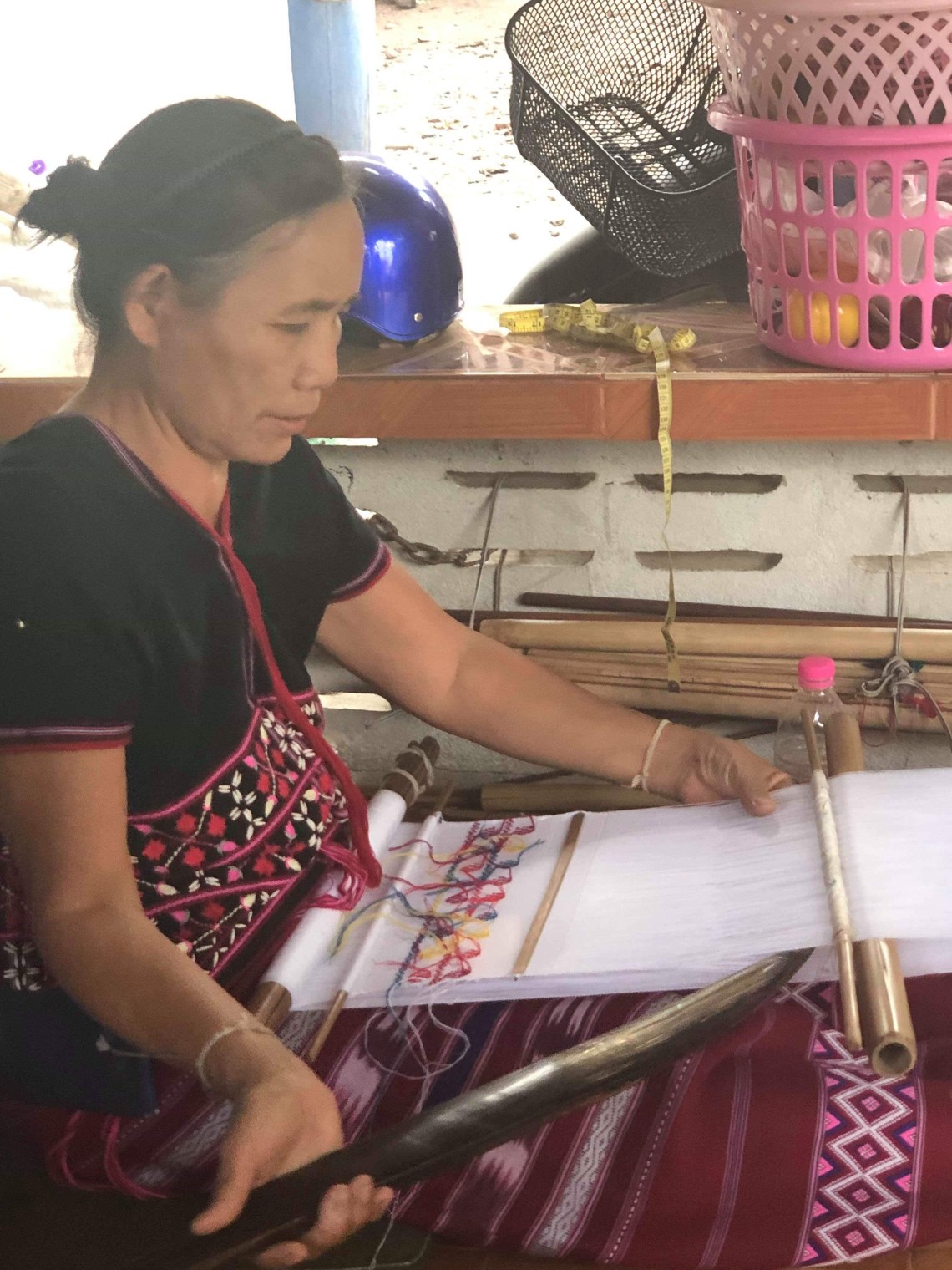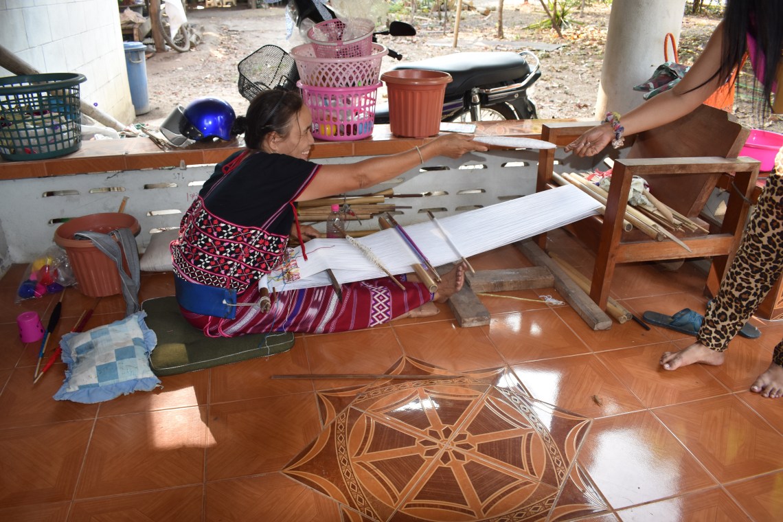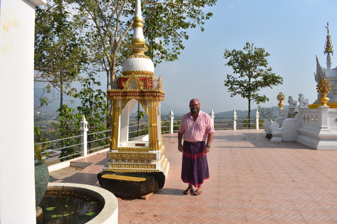 As we push on up the hill, which can only really be done in first gear as the incline is too steep for second. we continue to talk about what we have seen. And wonder what working in a camp like this might be like. Both of us have skills that would be useful in such a camp. After a few nervous hours we reach Mae Sariang, about 200 km southwest of Chiangmai. It is in a valley surrounded by mountains and forests. Its populated by The Shaun (or Tai Yao as the call themselves, a minority group who originated from southern China) and a mix of hill tribes such as The Karen, Lawa and Hmong. We are taken to a Karen tribal village. There is a temple and a shop selling goods made by the people particularly traditional hand woven clothing. The Karen cloth is woven using simple ‘back strap’ looms. The cloth is predominantly red with white, blue or brown vertical stripes. Unmarried girls of the Skaw group wear a plain white dress. The men wear simple forms if the cloth in a sleeveless tunic which of course is not made in ‘man size’! So they don’t fit me when we are asked to wear some traditional clothing to visit the temple at the top of a very steep drive. The village Ute takes all of us, including several very old woman in the back, up to the top. It is stunning and the views are amazing.
