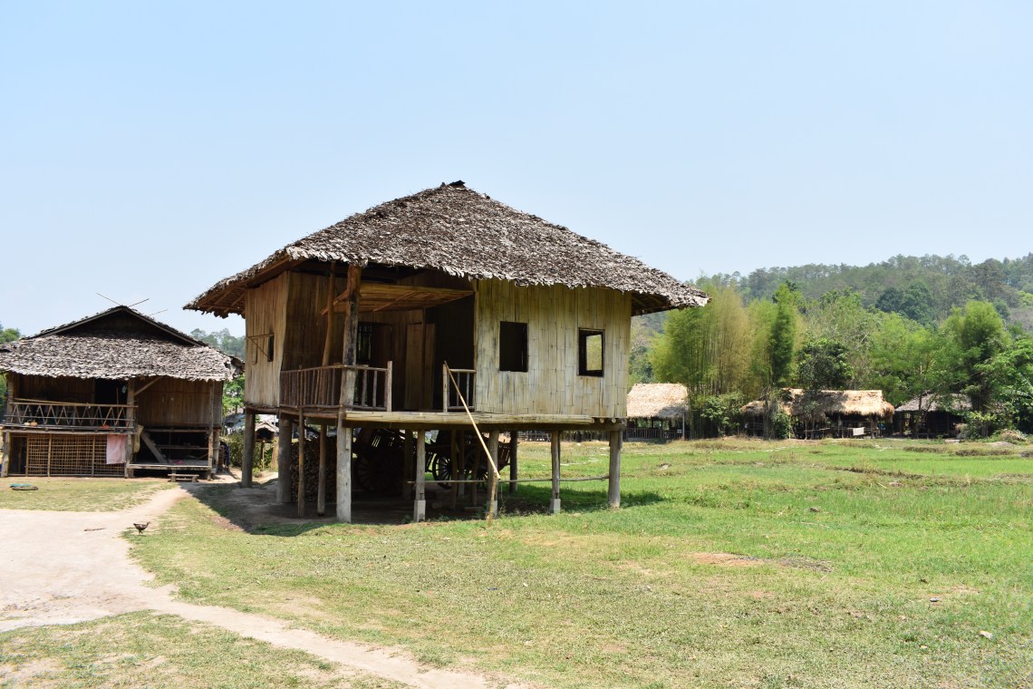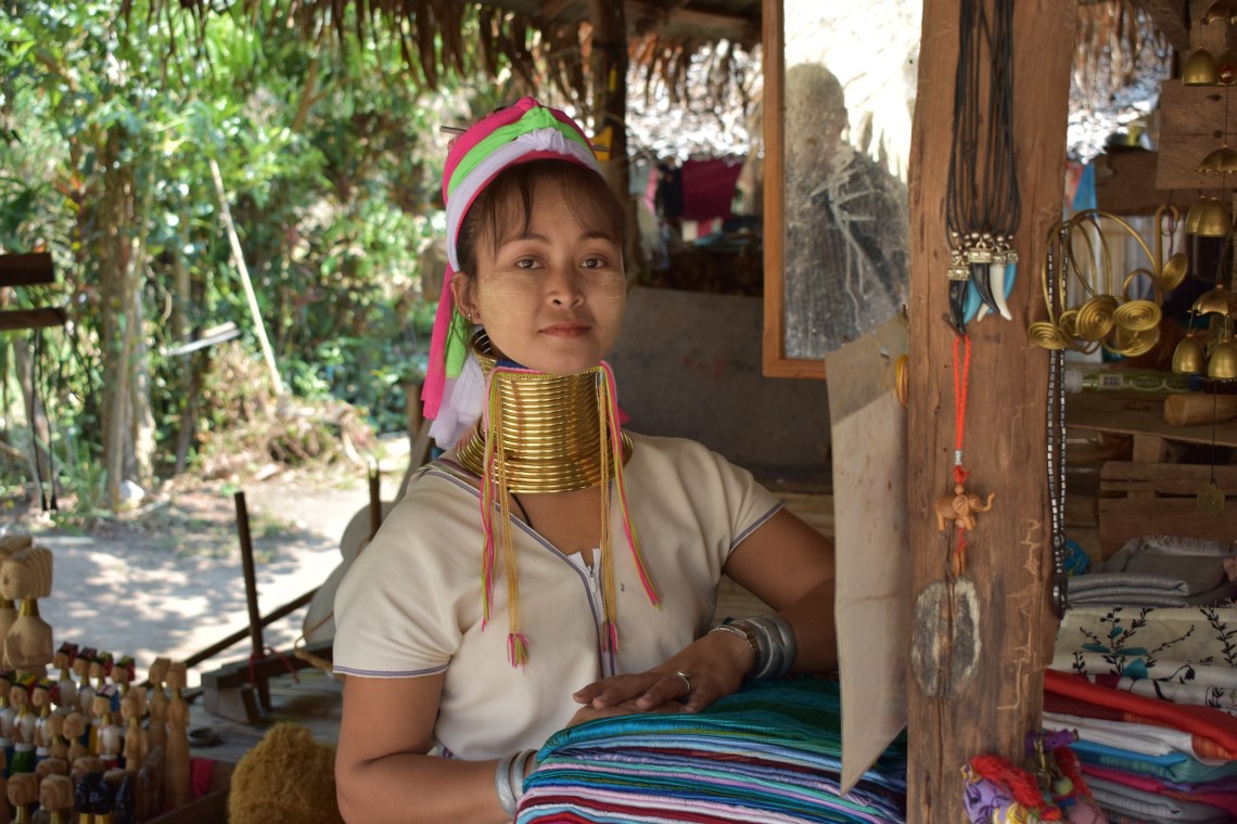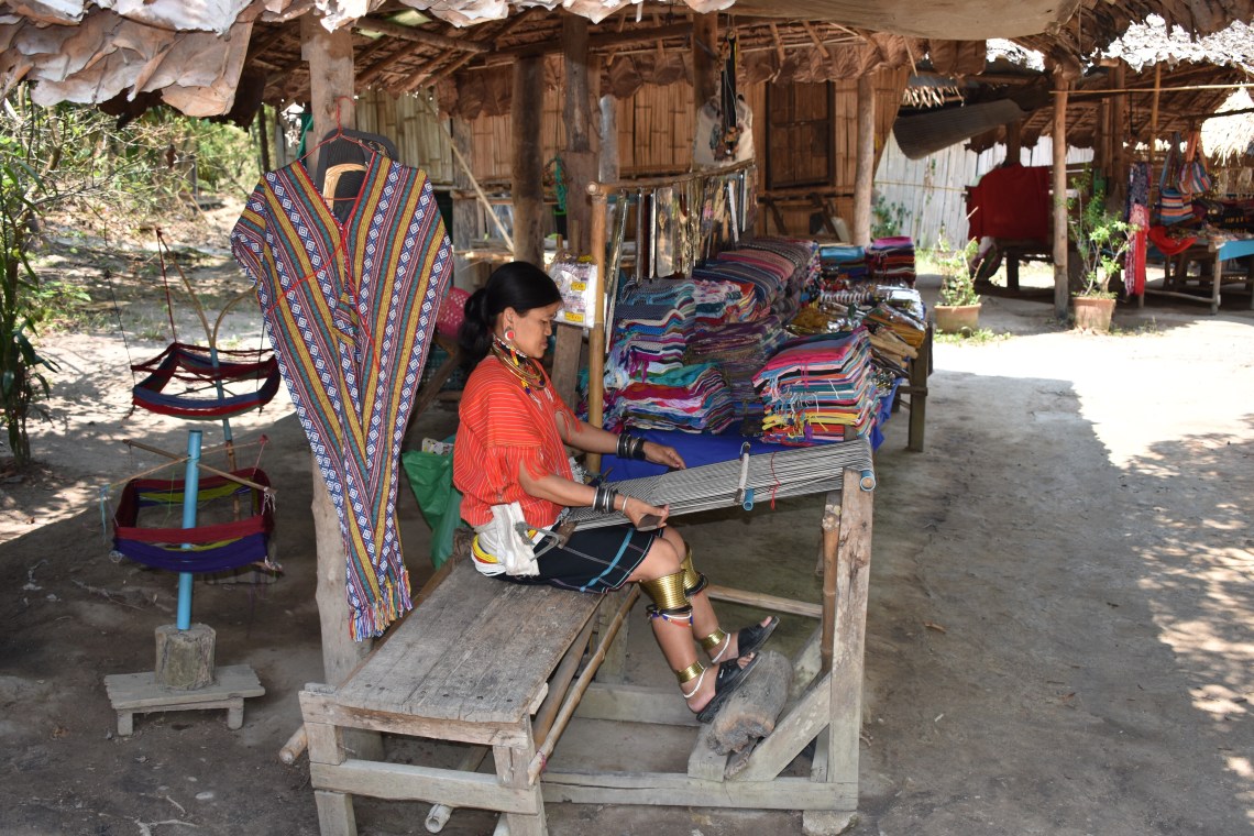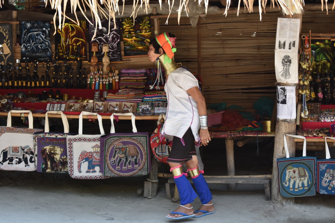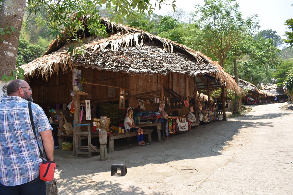The following morning we lye in til 8.30. It’s nice not to have to pack up and rush out of the hotel to meet Looket and Rung, and race off to the next place! So breakfast is relaxed and leisurely. Chiang Mai is quite a commercial and westernised place (McDonalds, KFC, Burger King etc etc) so Starbucks is our meeting place for Matt. A quick coffee and off in his car. We are visiting the Karen hill tribes about 40 minutes away. Their community has been given assistance to maintain their culture and way of life. The village is made up of many shacks, constructed from bamboo and banana leaves as roofing material. They are built on stilts to accomodate livestock below. The women are stunning. And almost intriguing. I’ve seen a couple of them in Nelson. What is to be intrigued about? Well….they are commonly called the Longneck women or Giraffe women. From the age of 5, a brass ring is added each year until they are 21. It is commonly thought that the neck is stretched, however the brass rings, which actually weigh quite a lot, push the rib cage down giving the neck its elongated look. Each family has a stall selling a variety of goods from woven cloth, traditional embroidery, knives, and other ethnic nick nacks. It’s all a bit commercial and aimed at the tourists who pay to visit.