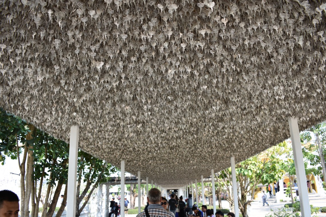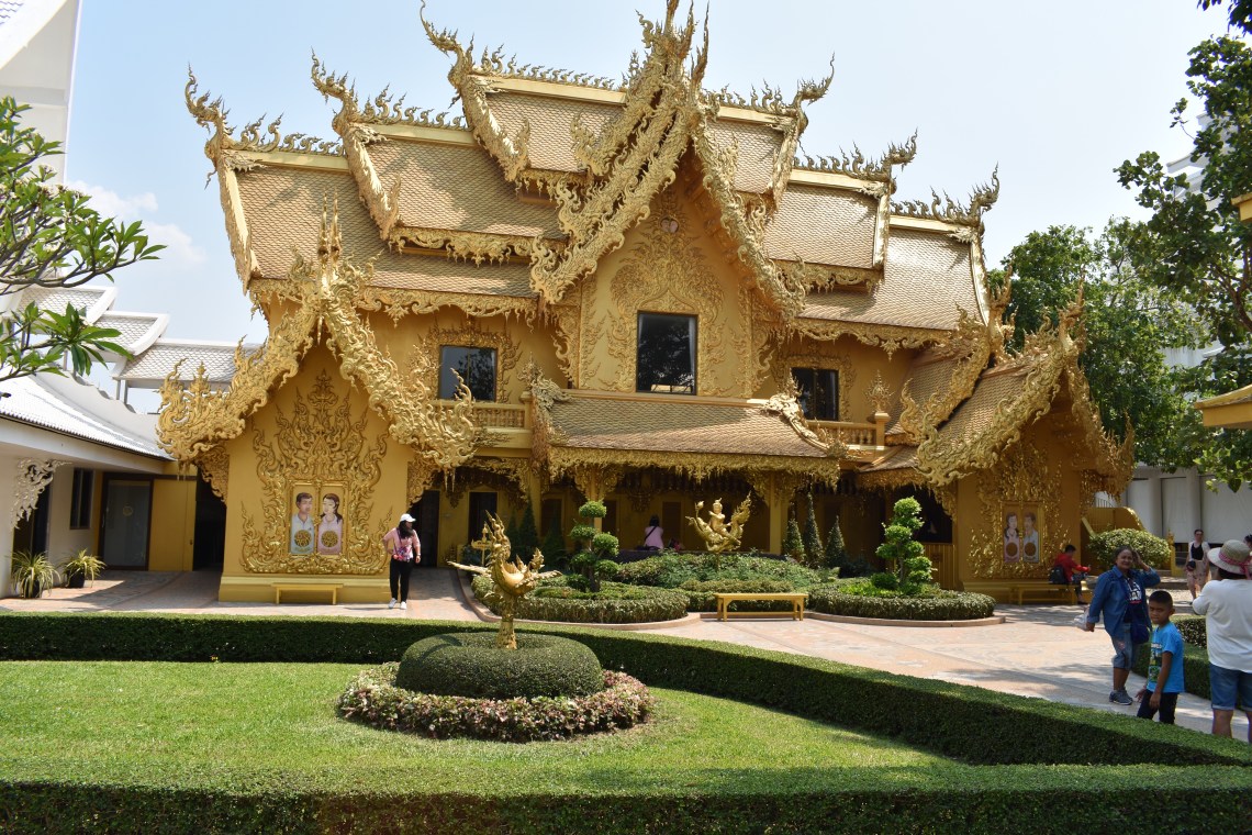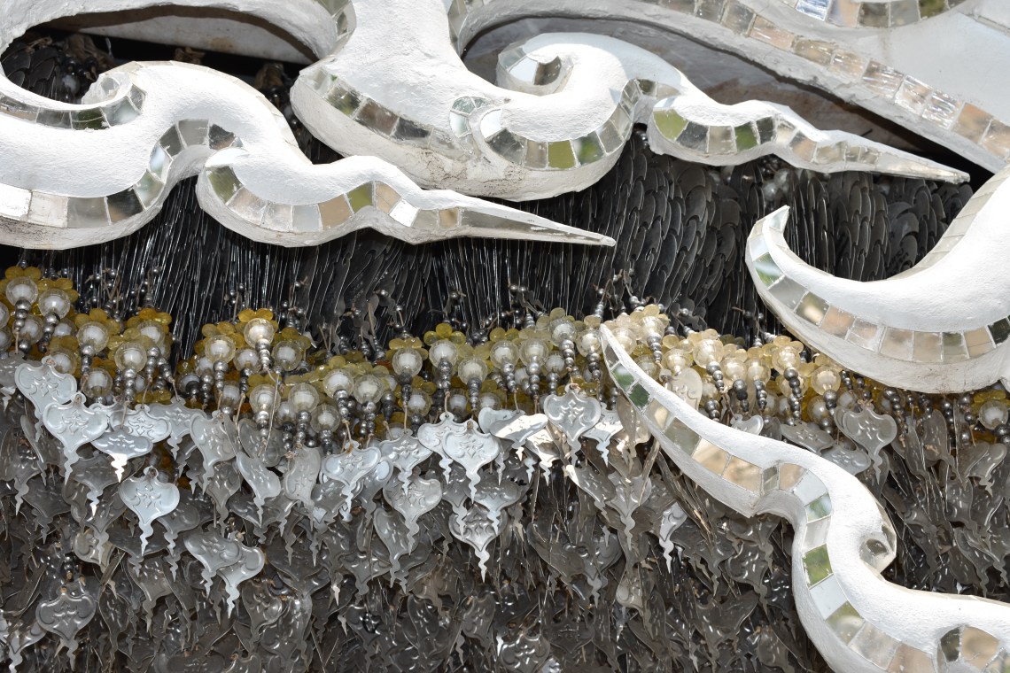 The designer, Chalermchai Kositpitpat a famous Thai visual artist ! Must have had ‘Carte Blanche’. It is extraordinary. White in colour signifying the purity of the Buddha. With glass that symbolises the Buddha’s wisdom and the Dhamma, the Buddhist teachings. Apparently it’s not finished and will eventually have nine buildings, including an Ubosot, a hall to enshrine Buddhist relics, a meditation hall, the monks living quarters and an art gallery. The toilet block by itself is quite a building, elaborate, and to distinguish it from the religious part golden.