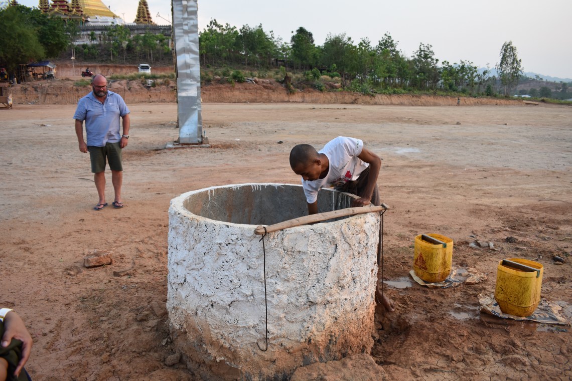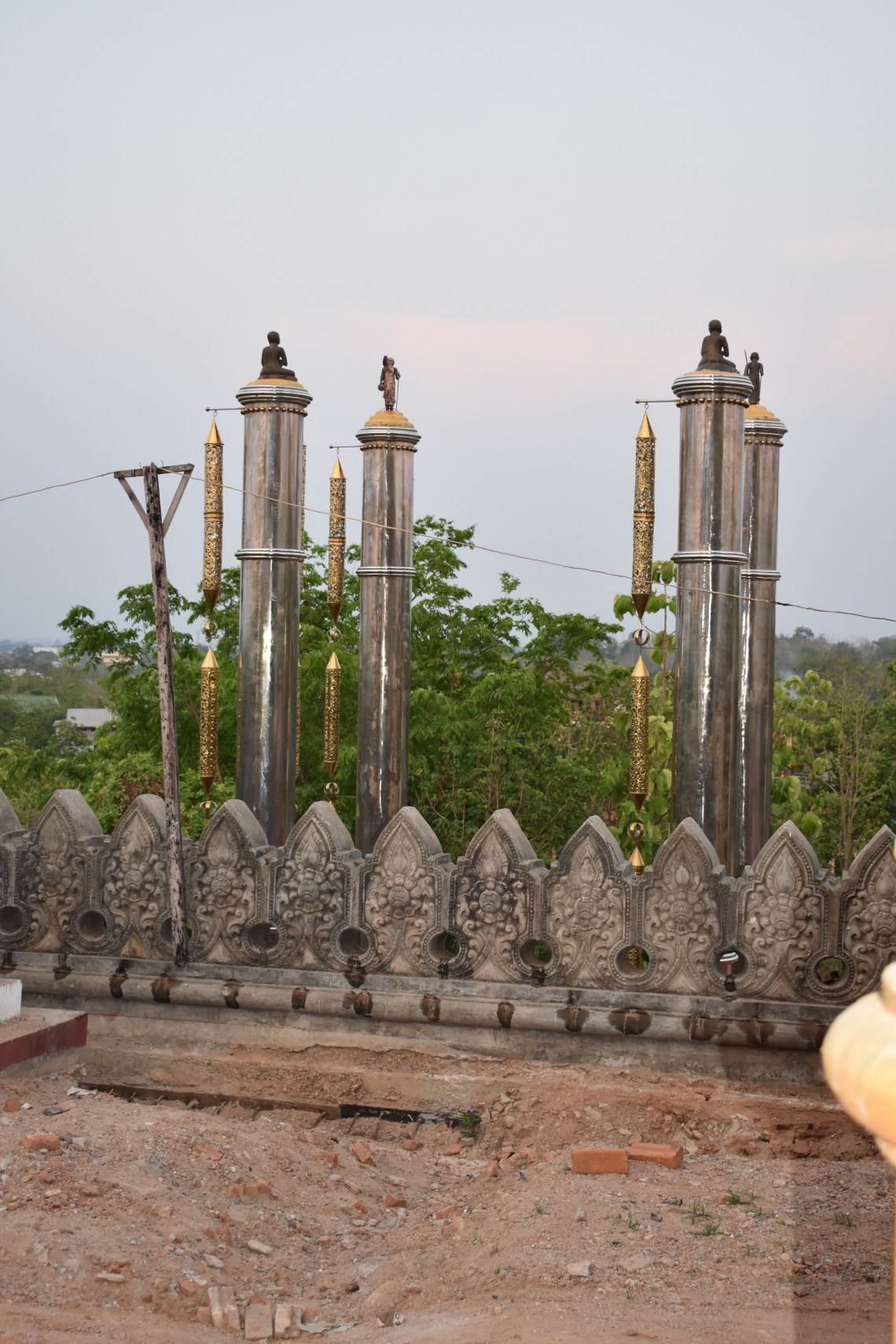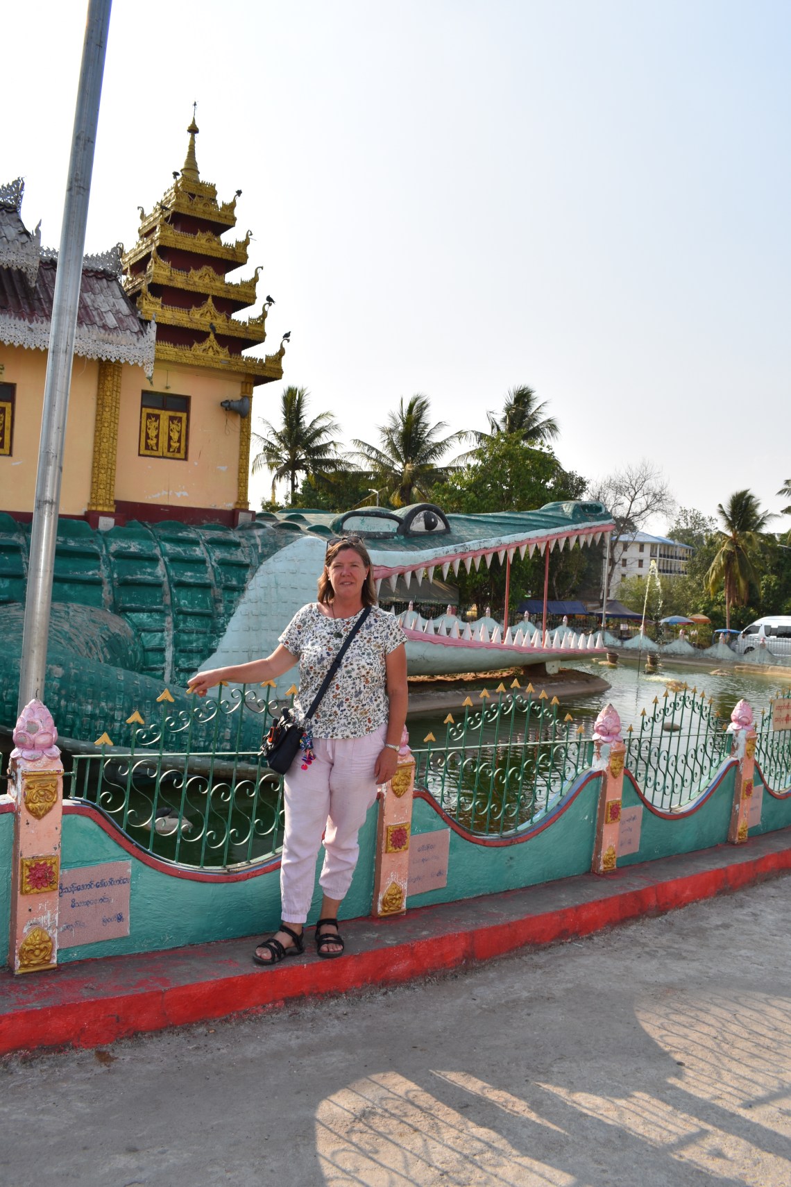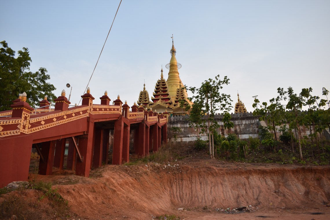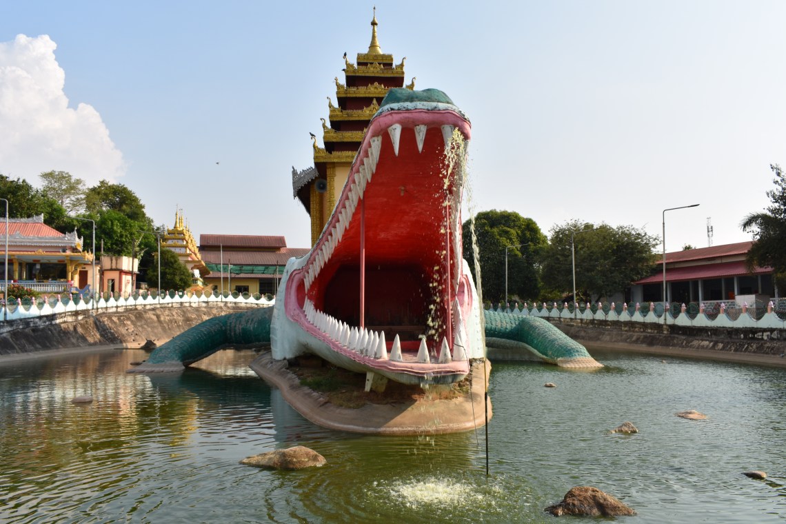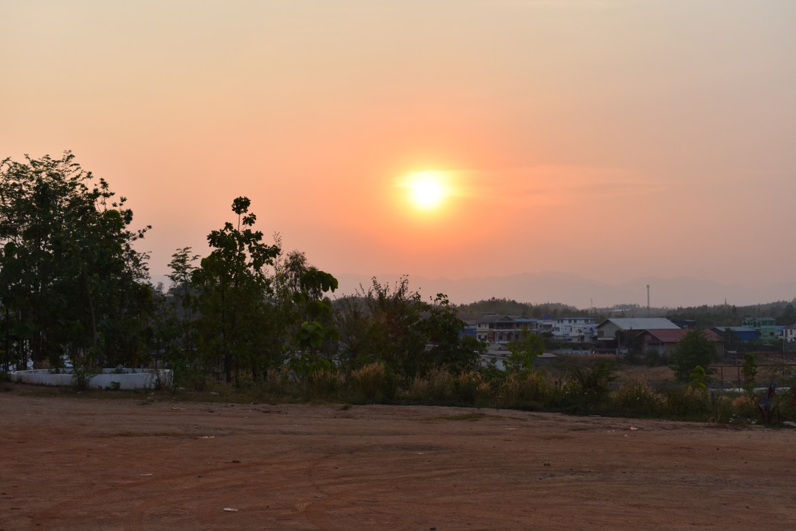 Myanmar has a different vibe to it quite relaxed and very poor. The roads are in disrepair and full of potholes. There is squalor and poverty every where, except the people smile and greet you with bright eyes. The houses and stalls even the formal cafes are simple and very quiet. There isn’t the noise or shouting that we had seen in Thailand. First stop was the crocodile temple a large plaster construction of a crocodile surrounded by a moat in which swim turtles and fish. Bells ring from the tops of the temples not loud bronze bells, but many small shiny tinkling bells, that sound in the breeze. As we only have a few hours across the border we are back in the car and whisked away to the next temple. A huge Hindu temple resplendent in gold and images of Buddha. Where we climb a long and wide stairway up to the magnificent temple with ornate cast concrete decorations and effigies everywhere. It too has a moat as well as high walls at its base lifting the temple high into the sky. Below is a large dusty area with a well in the middle. A young man carries two large drums suspended by rope from a wooden device that balances across his shoulders he skilfully throws a bucket down the well so that it tips into the water and fills rather than floats, and then quick as you like hauls it up filling the drums. The drums are then trudged off to a small shack surrounded by shrubs and bushes. He repeats this several times. As we talk to him through Looket, he chatters and smiles. His teeth stained reddy-brown by the nuts that he chews. Were not sure but think they might be Betle nuts? I’ve heard them used as a mild narcotic. The sun sets over Myanmar. Blood orange red sunset. Quite a sight. we head back to the town of Myawaddy and have tea and as it turns out coffee as well. Tea is green, whilst the coffee is a sweet white coffee with a type of heated milk that leaves bits in it the texture is odd but it tastes nice. Myawaddy is a happy place with none of the nearby conflict evident. Buddhists, Hindu, Christians and Muslims all living together in harmony, along with a multitude of stray dogs. The apparent poverty is eased by the lack of concern and the odd game of football. Next stop before returning for our passports is a casino! Yes I know with the poverty around it. We visit a new complex of shops including a duty free shop and casino. It’s a far cry from the simple traditional homes around it. As we leave we hear music, well a kind of music there is a crowd formed around a group of dancers dressed in elaborate dress. Women and Men dressed as woman dance in front of a statue. It’s quite a spectacle. Nearly 8pm so head back to the border. As we reach the archway we see that it is totally empty not a soul there. We exchange our “ticket” for our passports, and leave Myanmar back over the bridge to Thailand changing lanes midway! I’m pleased to have seen this, as it will now give us a perspective on the country we’ve only heard about on the news.