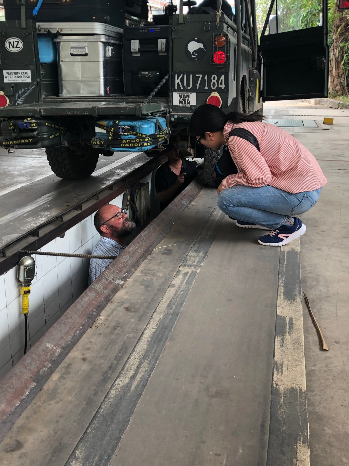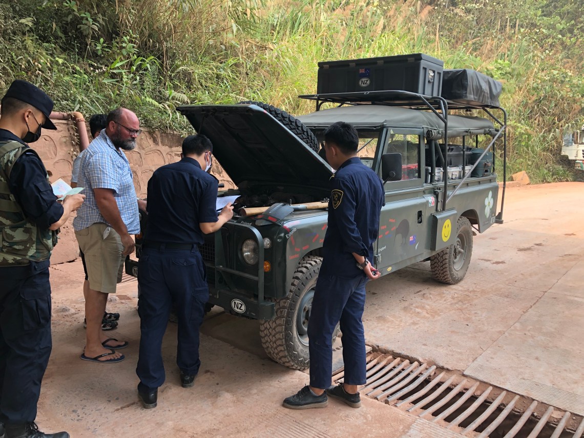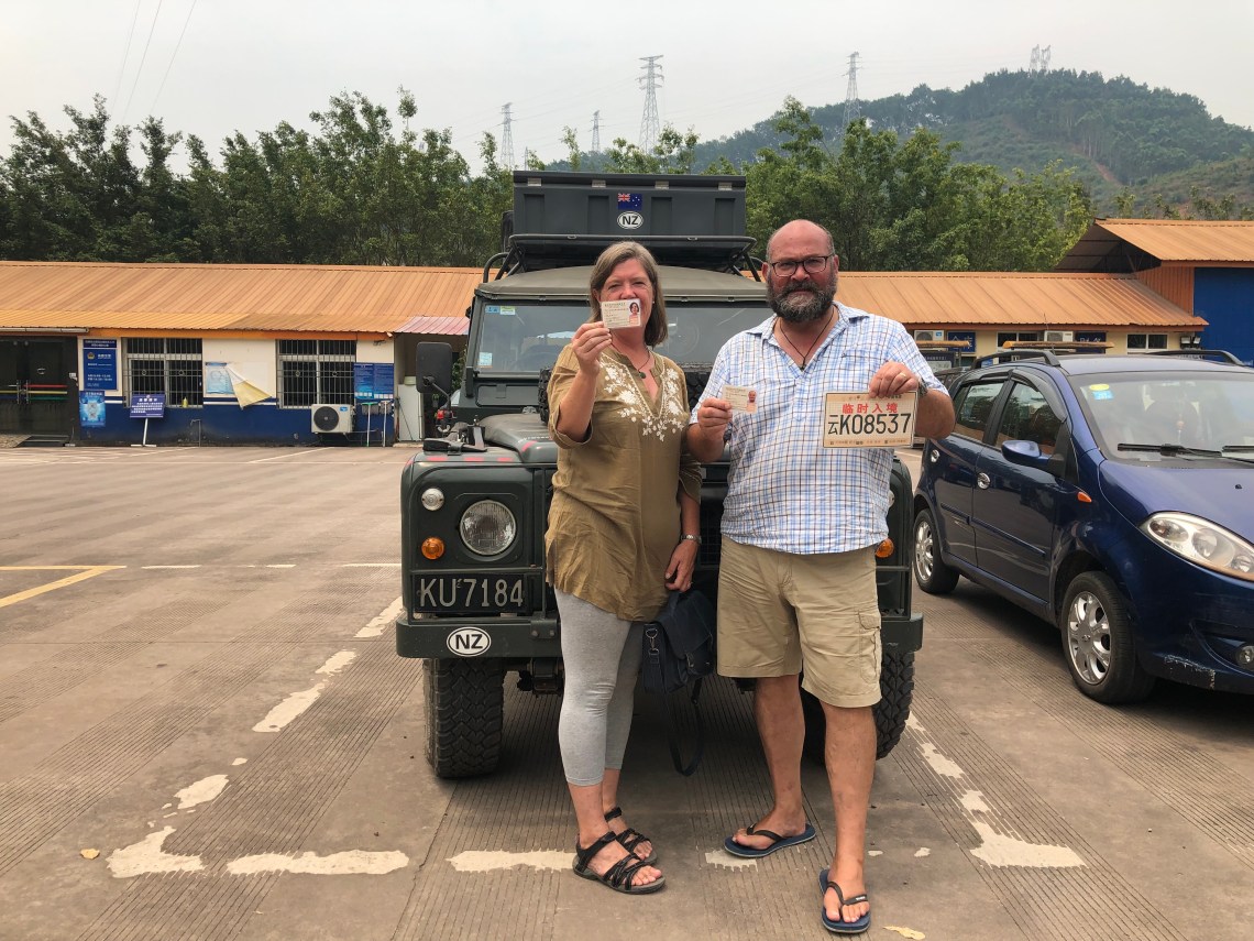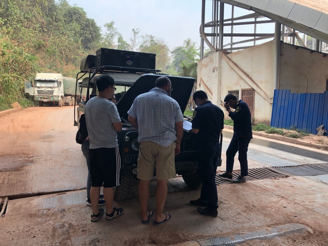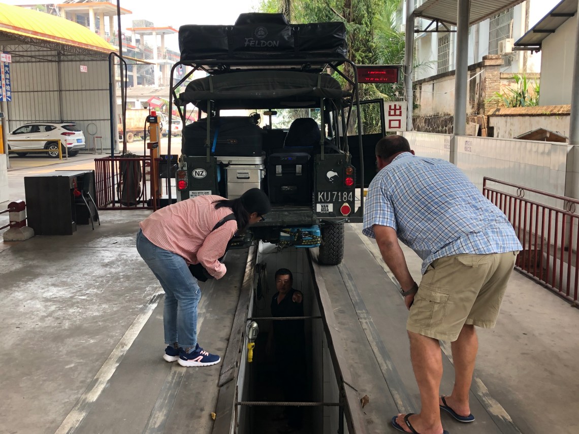 As he looks up and sees us his task comes to an abrupt halt. “Go back you cannot come through here, go that way”! Pointing back to Laos! I calmly tell him we have a guide waiting for us on the other side. Then he disappears, and returns handing over his protective gear and backpack sprayer to another man. They walk around Fred looking at the pioneer tools on his bonnet, inside the back and then back at us. “Go over, park and don’t leave vehicle”! He leaves and returns a short while later with his phone and a translator app. “Have you foreigners organised paperwork formalities”? I once again tell him that, “we have a guide who has organised all this and will be waiting for us on the other side or in the immigration hall”. I have taken a screen shot of an email from Anton with her name and number just in case. This I show him. He calls the number and appears to rant over the phone at her in Chinese! The man apologised for the delay and asks us to follow him to the immigration hall, where on the other side of the barriers and glass screens is a girl waving and smiling to us. This is Yingchu Zhao, our guide.